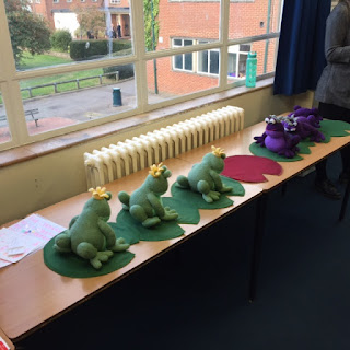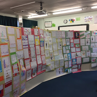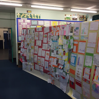 My colleagues each set out their class' work on the large sugar paper sheets given to them. Work was checked for accuracy and spellings, etc before going up on display.