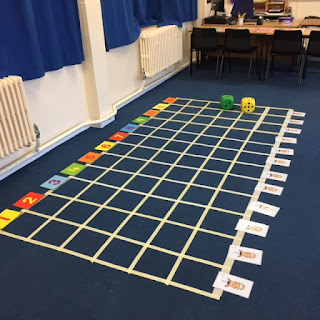 The good ol'Horse Race. For those who don't know...you roll two dice add the scores on the dice together and that's the numbered 'horse' that moves forward one square in the grid. You keep going until one horse makes it out of the grid. The students/parents/student helpers are the 'horses' and I/the student helpers roll the two large foam dice to generate the numbers. Lots of fun and engagement from our visitors and throughout the rolling (the dice take a while to stop) we have lots of discussions around which 'horse' should win, which is most likely, which 'horse' can't win and why, etc. I use a random dice generator website on my iPad to speed up the rolling! The large dice are there to emphasise that a 6 on the first dice and a 4 on the second is a different outcome to a 4 on the first dice and a 6 on the second, etc.
