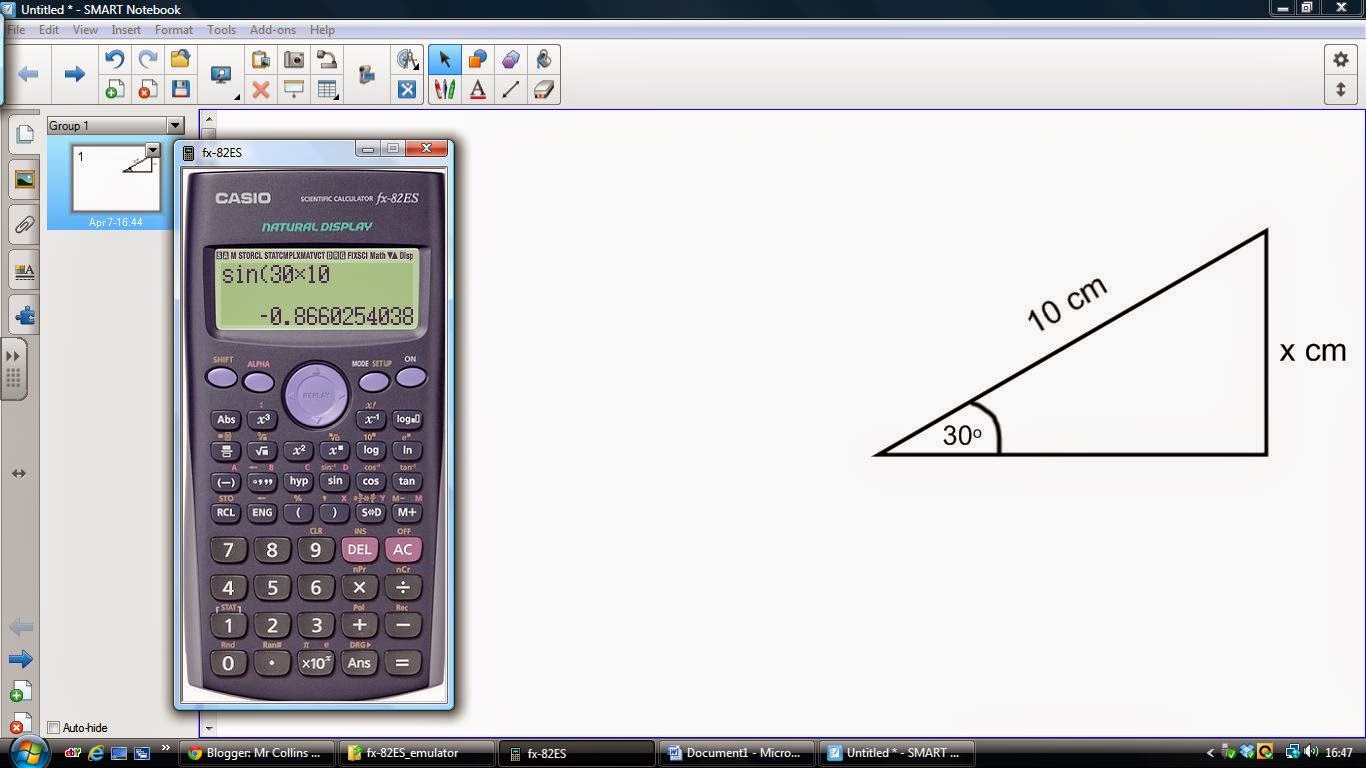 So, it was by luck that I found a solution to this problem this term. The solution came in the guise of one of my department's ITT students who had a Casio calculator that could be used on the IWB! How this is wonderfully possible is that the Casio people have created emulator software that allows you to do on screen to a calculator you'd have bought. This was exactly what I was looking for as so many higher tier students need to be shown, properly, how to use their scientific calculators when performing trig calculations, roots, powers etc etc.