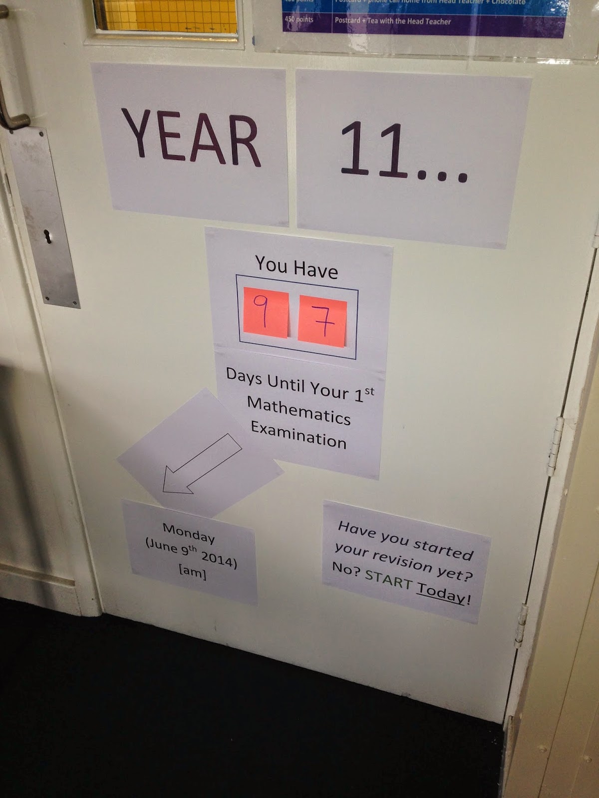 So, just under 100 days before their 1st GCSE Mathematics examination (we do the Edexcel Linear [1MAO] spec) I put up the following display on the back of my classroom door. Each day, having double checked with my 'DaysUntil' app, I change the number of days left until their 1st Mathematics GCSE examination. This display is all aimed at making them aware of how much (or little) time they have left. In the majority of our lessons it has been referred to and it's strange how much impact it is having on some of my students. For example, I often here a lot of 'Ooo, we've only got 74 days left' or 'te he he, 69 days left' (a popular day)!