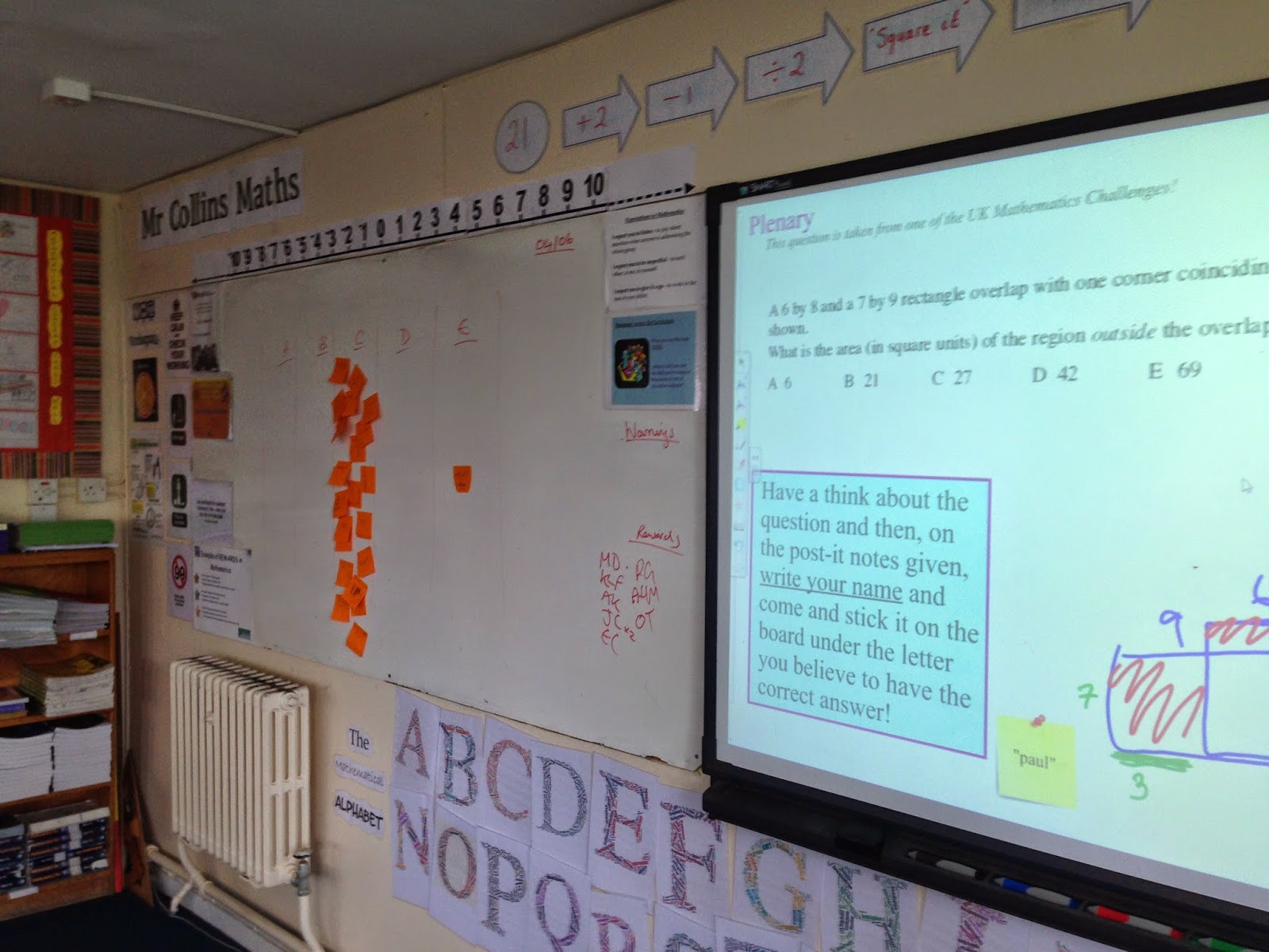 I gave each student a post-it note and told them to put their name on it. I then, on my whiteboard, wrote the letters A-E, split into 5 separate columns. On my IWB I then displayed the question to the class and told them that I would read the question out to them, give them a bit of time to think about it, then, when they had an answer, they'd come up to the board and place their named 'post it note' on the board under the letter's column they believed to be true. After reading the question, I gave the class a bit more support by drawing a diagram of the 6 by 8 and 7 by 9 rectangles and then, using SMART notebook, dragged them over the top of one another to create the overlapping shape in the given question. This was a really good visual representation of the problem and soon allowed students to start noticing the dimensions of the shaded areas to work out (see image below).
